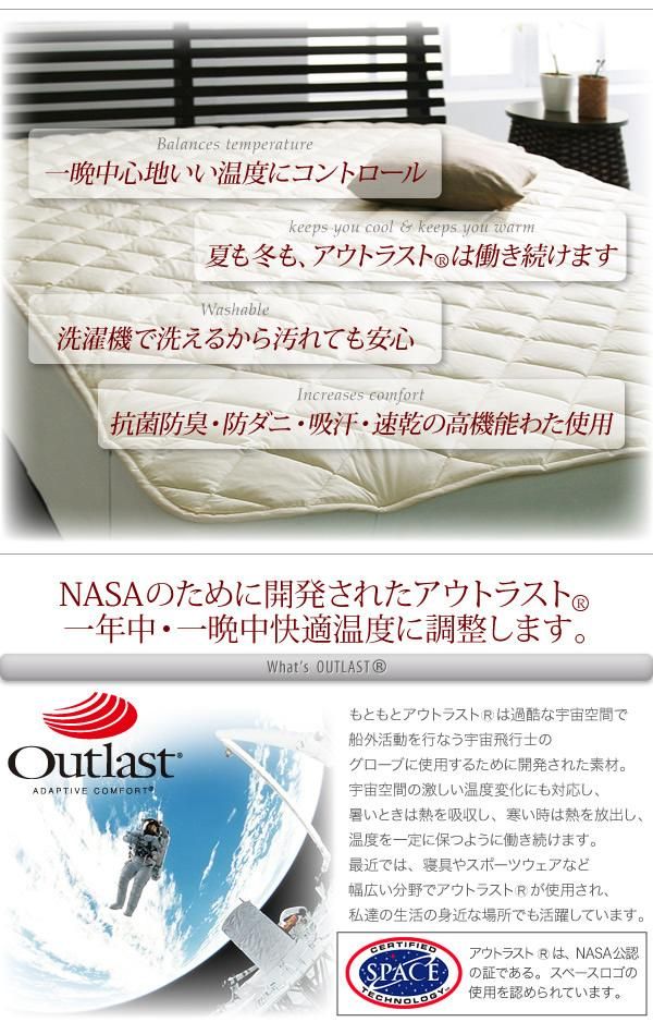 アウトラストとは、NASAの宇宙飛行士の船外活動のために開発された温度調整素材。肌の温度に反応して、熱をコントロール。暑い時は涼しく、寒い時は暖かく、布団内部の温度を調整します。エアコンや電気毛布のように電力を使わないので、体にもお財布にも地球にも優しい、まさに理想的なお布団です。