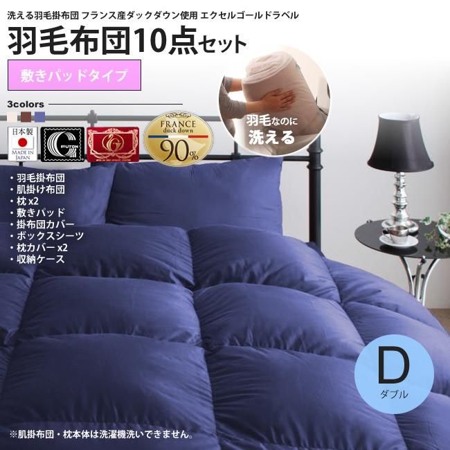 羽毛布団セットダブル敷きパッドタイプ 洗える羽毛掛け布団 フランス産ダックダウン 布団セット