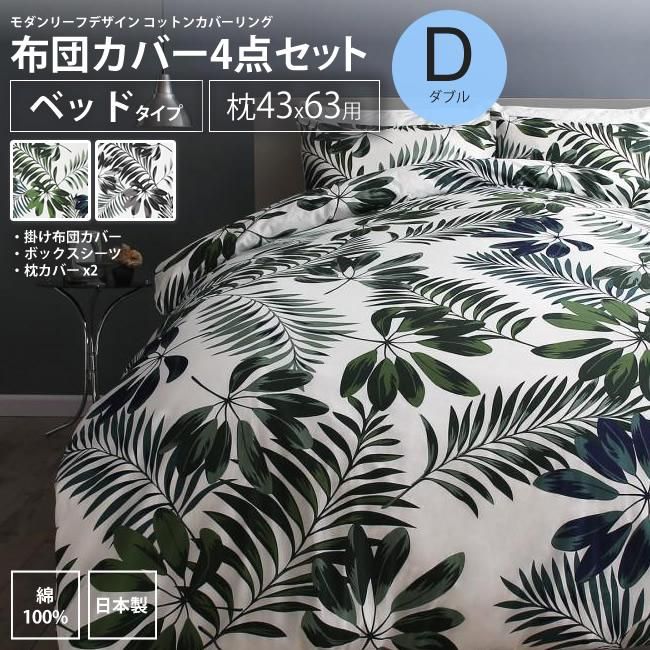 商品名 布団カバーセット 4点 ダブル ベッド用 枕43×63用 : モダン リーフデザイン コットンカバーリング カバー、シーツセット