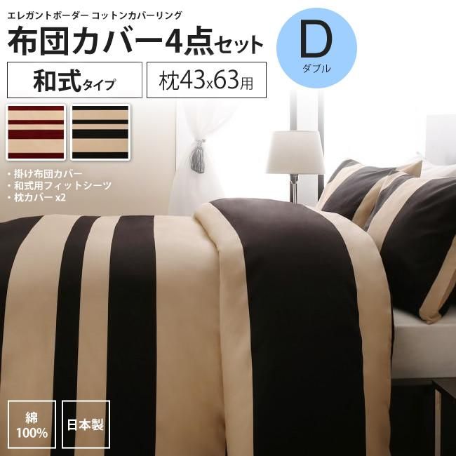 商品名 布団カバーセット 和式用 4点 ダブル 枕43×63 エレガント ボーダー コットンカバーリング カバー、シーツセット