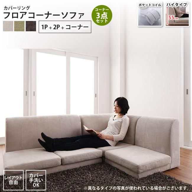 ソファー 3点セット(1P+2P+コーナー) ハイタイプ ポケットコイル仕様 カバーリングフロアコーナーソファー ソファ